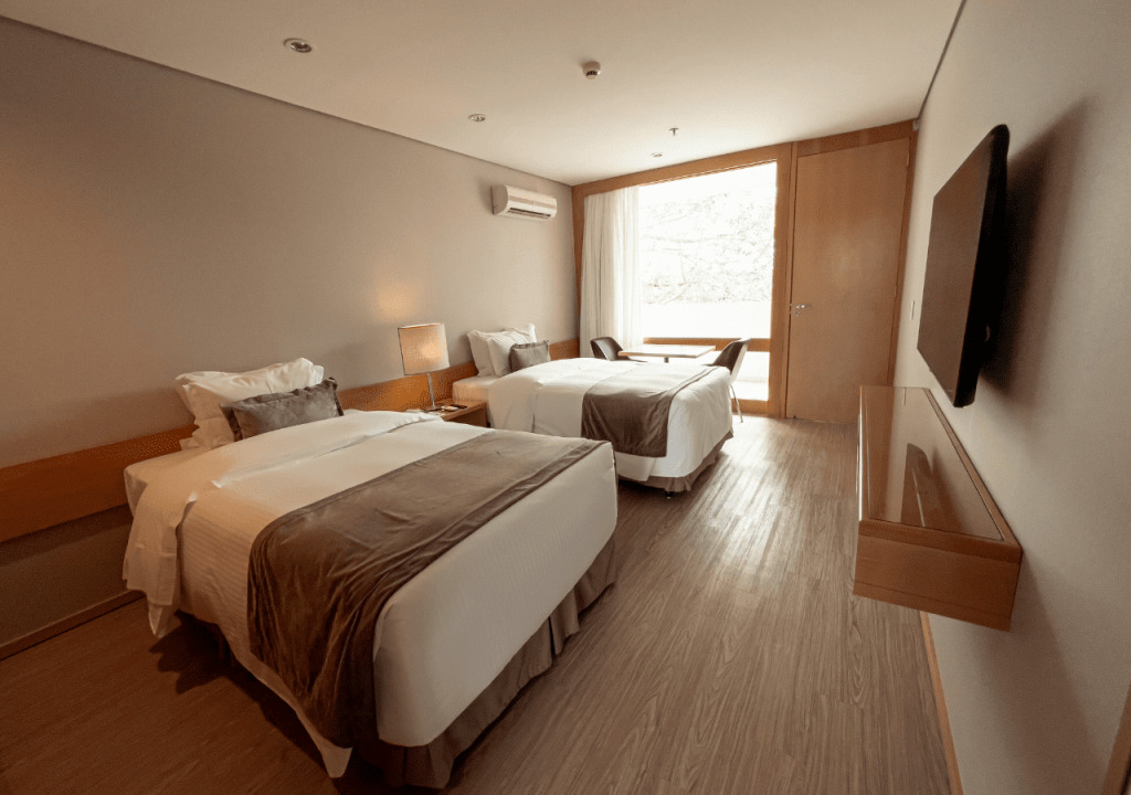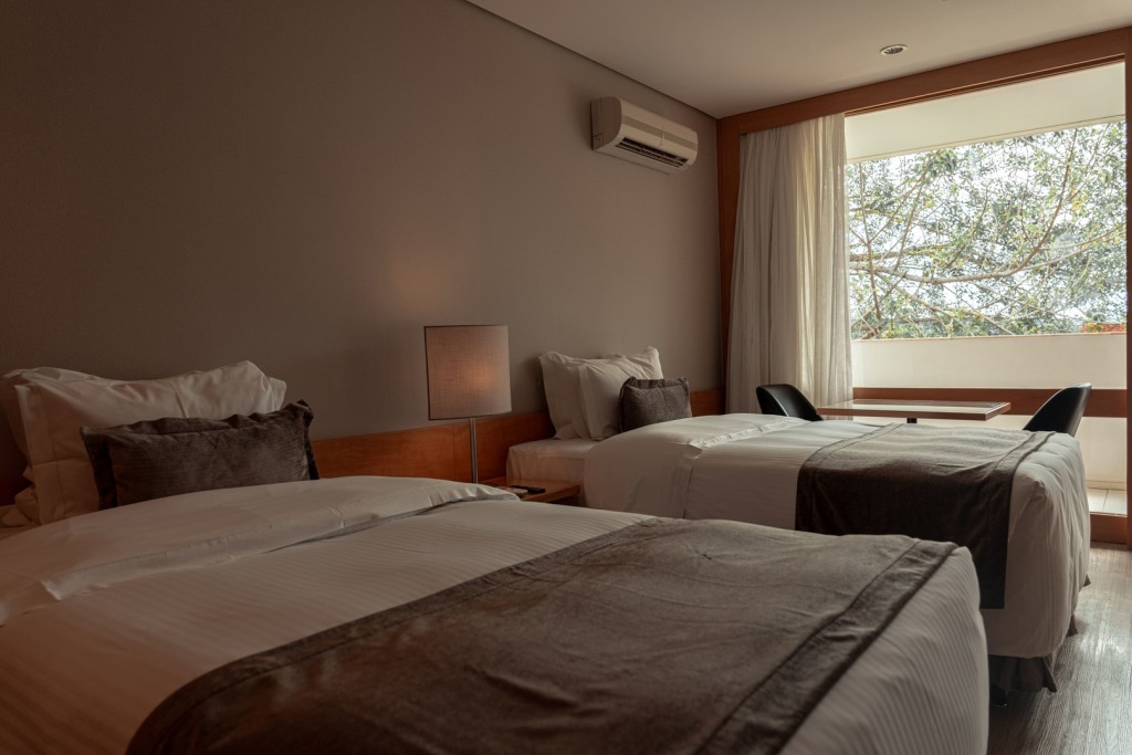 Мы выбрали этот отель, потому что заявлено легендарным бразильским архитектором Оскар Нимейером. Лобби находится ниже главной двери и довольно маленький, поэтому было бы что-то вроде давки, если бы многие люди регистрировались в то же время. Сотрудники очень приветливы и любезны и говорят на английском языке. Есть настоящая долго идти от лифта до некоторых номеров, но это не должно умалять посетителя от пребывания здесь. Сами номера функциональные, просторные и имеют террасу. В номере есть даже на стойке регистрации. Большая территория, на которой расположен отель, ведут к озеру. В отеле есть большой бассейн, который выглядел чистым, когда мы прибыли в отель. Ресторан хороший, и обслуживание довольно быстрое. Нам очень понравилось наше пребывание и, конечно, вернемся сюда, и не только для центра отдыха в Оскаре Нимейере создавал дизайн отеля. Незабываемый.